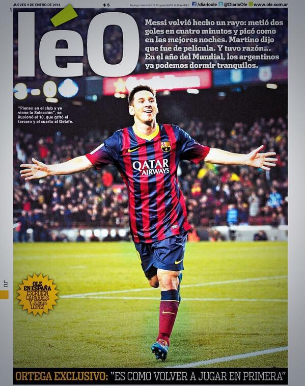 Cover: Argentinean sports paper "Olé" change their name to "léO" after Messi's comeback